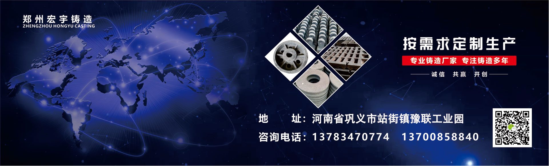鄭州宏宇鑄造位于河南省鄭州鞏義市是鑄造件廠家,主要生產(chǎn)生鐵機械配件、耐磨襯板、耐磨錘頭、合金耐磨錘頭、制砂機錘頭、鑄鋼件、高鉻合金鑄件、球墨鑄鐵件、消失模工藝鑄件、砂型工藝鑄件等!來樣即可加工。 我們技術(shù)力量雄厚、設(shè)備齊全,目前有高級技師數(shù)名,技術(shù)人員數(shù)十名,能滿足客戶的不同需求,來圖來樣均可生產(chǎn),而且為了確保產(chǎn)品質(zhì)量進一步得到完善和提高, 確保供貨及時達到客戶的滿意,我們采用優(yōu)質(zhì)原材料及先進的制造工藝!